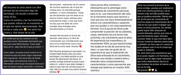 He tenido el honor de conocer profundamente a más de 200 personas traduciendo los mensajes del cielo desde su carta natal, esto les ha permitido (RE)conectarse con quienes son, comprenderse, ser más compasivas, sanar lo que las limita, expandirse desde su potencial y amar lo que son.